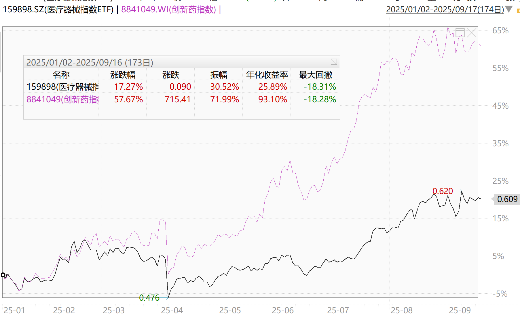 目前医疗器械指数ETF(159898)是跟踪指数年内涨幅最高的,2025.1.2-9.16期间上涨17.27%,对比创新药指数明显滞涨。因此,在创新药分歧加大、标的指数又趋势向上的背景下,下一阶段很有可能会开启新一轮行情。