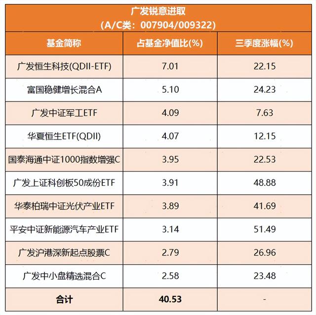 在组合前十大重仓基金中,三季度期间,有8只基金的持仓涨幅超过20%,为广发锐意进取的净值增长做出了不小的贡献。