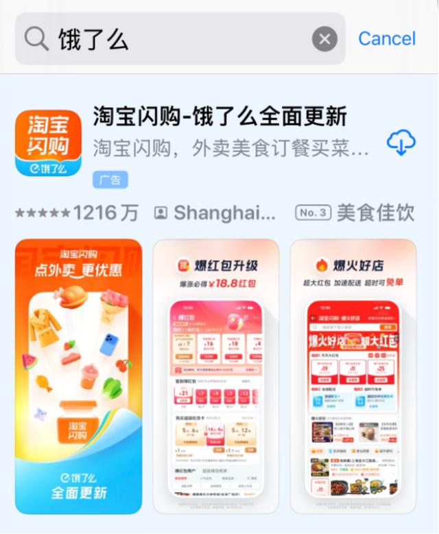 据《财经涂鸦》实测,12月15日,在苹果手机应用商店中搜索“饿了么”,可下载APP已显示为“淘宝闪购”。