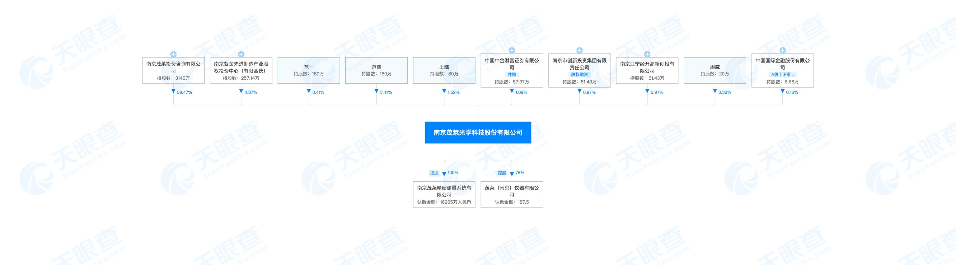 天眼查信息显示,茂莱光学成立于1999年,前称为南京茂莱光电有限公司,于2015年改制为股份公司。目前,该公司的注册资本为3960万元,法定代表人为范一,股东包括南京茂莱投资咨询有限公司、南京峰岭资本、范一等。