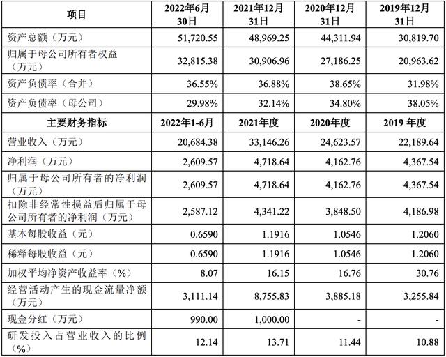 2019年、2020年、2021年和2022年上半年,茂莱光学的收入分别为2.22亿元、2.46亿元、3.31亿元和2.07亿元,净利润分别为4367.54万元、4162.76万元、4718.64万元和2609.57万元,扣非后净利润分别为4186.98万元、3848.50万元、4341.22万元和2587.12万元。