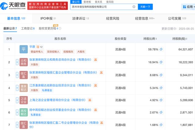 天眼查App信息显示,丰倍生物成立于2014年7月。目前,该公司的注册资本约1.08亿元,法定代表人为平原,主要股东包括平原、张家港保税区众和商务咨询合伙企业(有限合伙)、毅达资本等。