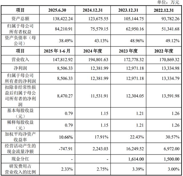2022年、2023年、2024年度和2025年上半年,丰倍生物的营收分别约为17.09亿元、17.28亿元、19.48亿元和14.78亿元,净利润分别约为1.33亿元、1.30亿元、1.24亿元和8506.33万元,扣非后净利润分别约为1.36亿元、1.23亿元、1.15亿元和8470.27万元。