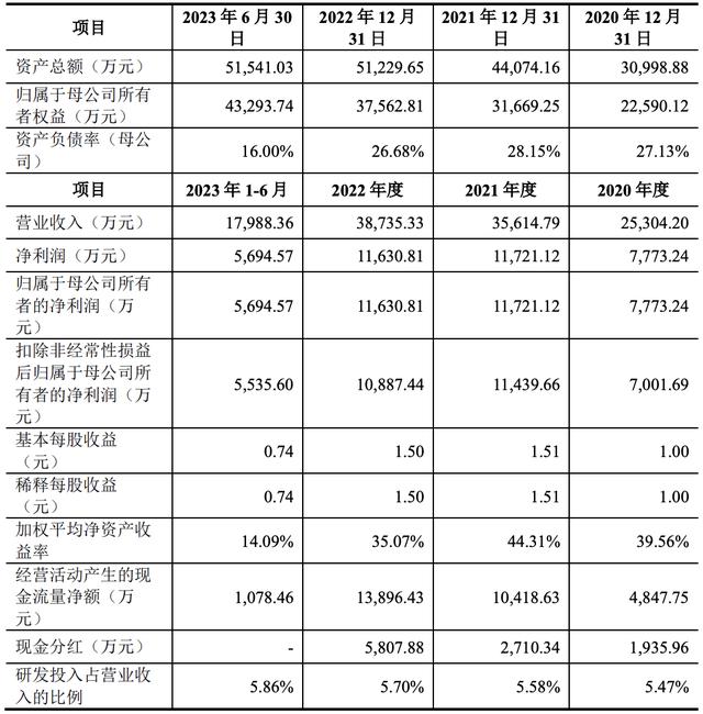 2020年、2021年、2022年和2023年上半年,思泰克的收入分别为2.53亿元、3.56亿元、3.87亿元和1.80亿元,净利润分别为7773.24万元、1.17亿元、1.16亿元和5694.57万元,扣非后净利润分别为7001.69万元、1.14亿元、1.09亿元和5535.60万元。