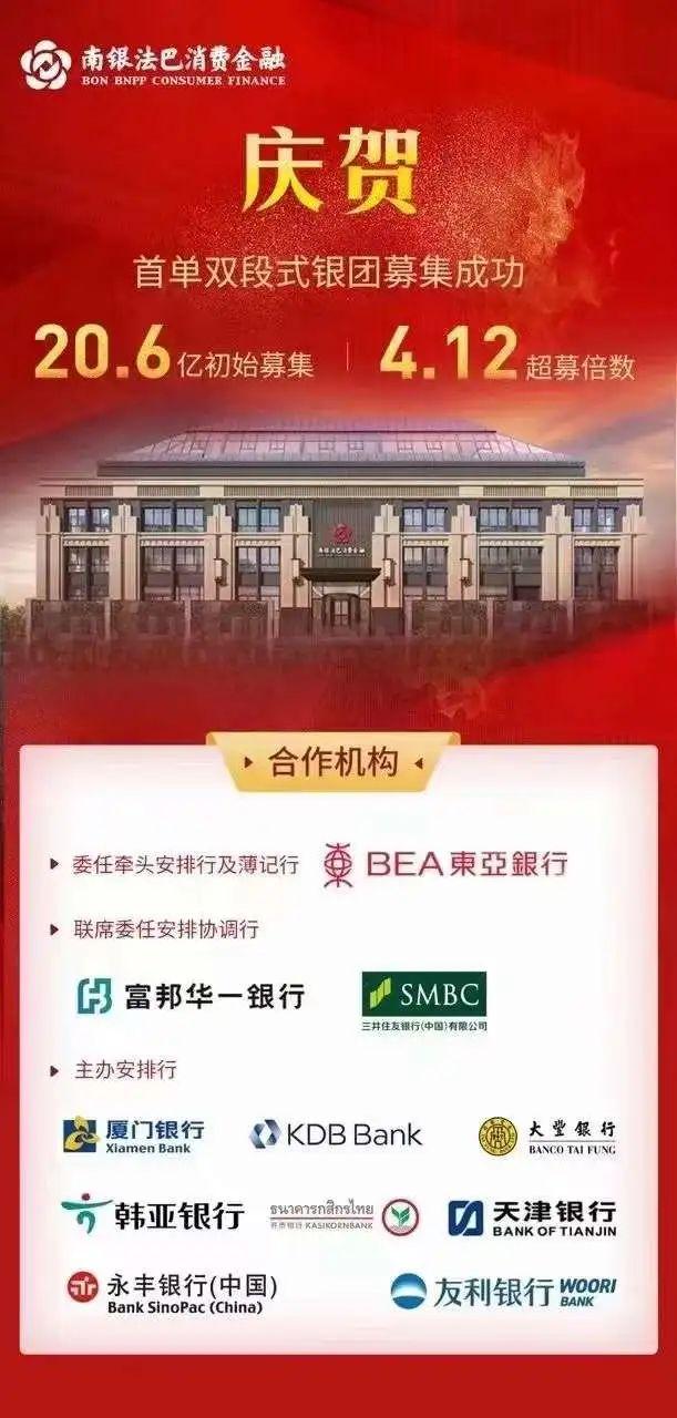 近日,消金界了解到,南银法巴消费金融有限公司(以下称“南银法巴消金”)首单双段式银团募集成功,初始募集金额20.6亿元,超募4.12倍,一举超越中邮消金此前的13亿元,打破行业记录。