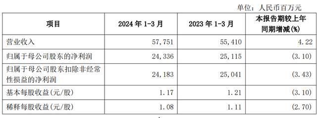 根据最新披露的季报,兴业银行2024年一季度实现营业收入577.51亿元,较2023年同期的554.10亿元增长4.22%。然而,该行的净利润为243.36亿元,较2023年同期的251.15亿元下降3.10%,扣非后净利润亦下滑3.43%。
