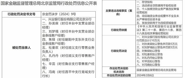 据统计,兴业银行及其分支机构2024年第一季度涉及的罚单共8张,罚没金额累计超500万元。其中,兴业银行北京分行还曾接到以百万计的大额罚单,共计罚款210万元,另有2名负责人分别被罚5万元,7名相关人员被处以警告。