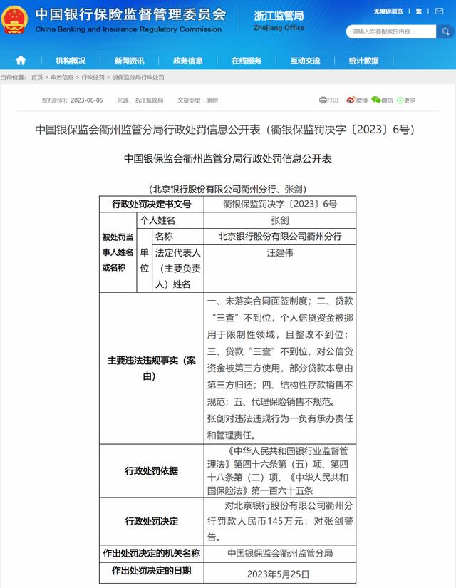 而就在前不久,6月5日,国家金融监督管理总局披露的罚单显示,北京银行衢州分行因个人信贷资金被挪用于限制性领域等多项违规行为被罚款145万元。同时,相关负责人被予以警告。