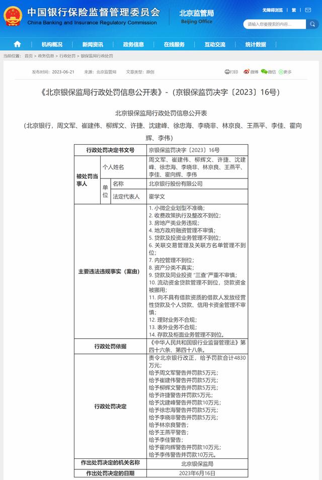 6月21日公布的罚单,北京银行涉及的违规事实包括:小微企业划型不准确;收费政策执行及整改不到位;房地产类业务违规;地方政府融资管理不审慎;贷款及投资业务管理不到位;关联交易管理及关联方名单管理不到位;内控管理不到位;资产分类不真实;贷款及同业投资 “三查”严重不审慎;流动资金贷款管理不到位,贷款资金被挪用;向不具有借款资质的借款人发放经营性贷款及个人贷款、信用卡资金管理不审慎;理财业务不合规;表外业务不合规;存款及柜面业务管理不到位。罚款合计4830万元,12位相关责任人被警告并罚款。