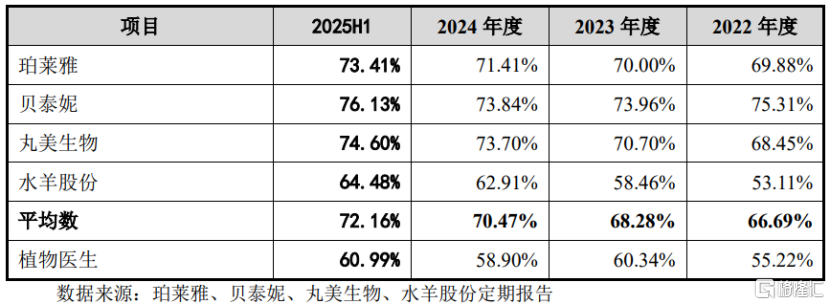 公司生产所需的主要材料包括活性物、油脂、蜡类等内容物原料,以及外盖、玻璃瓶、塑料瓶等包装材料。2022年、2023年、2024年、2025年1-6月(简称“报告期”),植物医生向前五大供应商的采购金额占比均超46%。