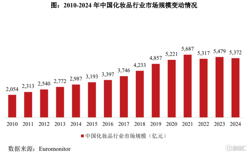 近几年,随着宏观经济增速放缓及行业竞争加剧,中国化妆品市场增长几乎停滞,2024年市场规模为5372亿元,低于2021年水平。行业也由前期较为粗放的“量的扩张”演变为高品质、强品牌的“质的提升”。