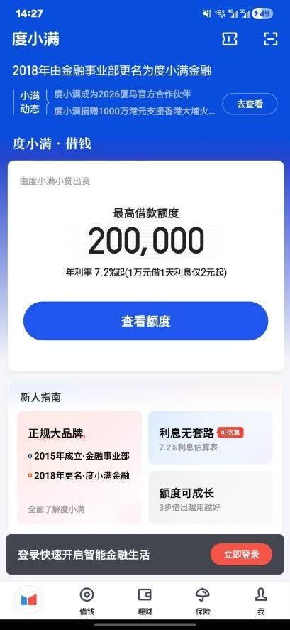我们以行业头部的合规平台度小满为例,在度小满APP页面,明确标识“年利率7.2%起(1万元借一天仅2元起)”。