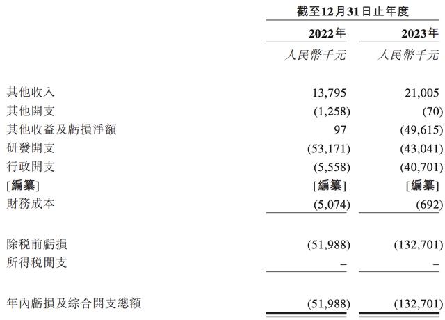 2022年、2023年,盛禾生物分别获得其他收入1379.5万元、2100.5万元,研发开支分别为5317.1万元、4304.1万元;净亏损(年内亏损及综合开支总额)分别约为5198.8万元、1.33亿元,同比扩大155.25%。
