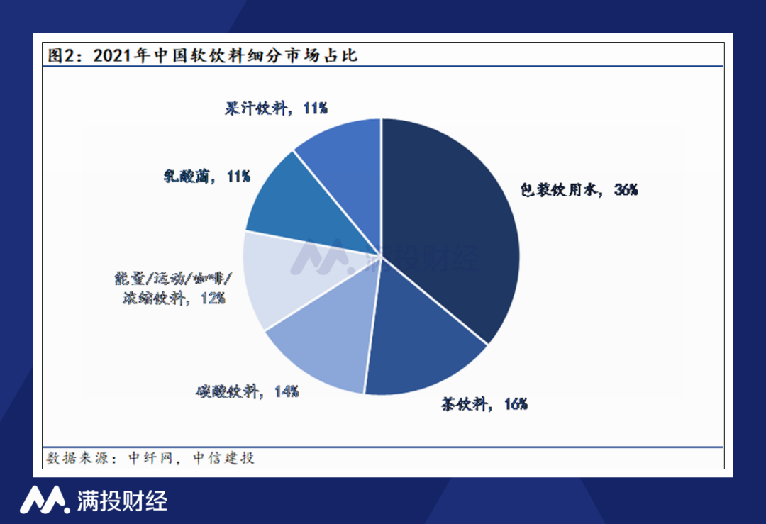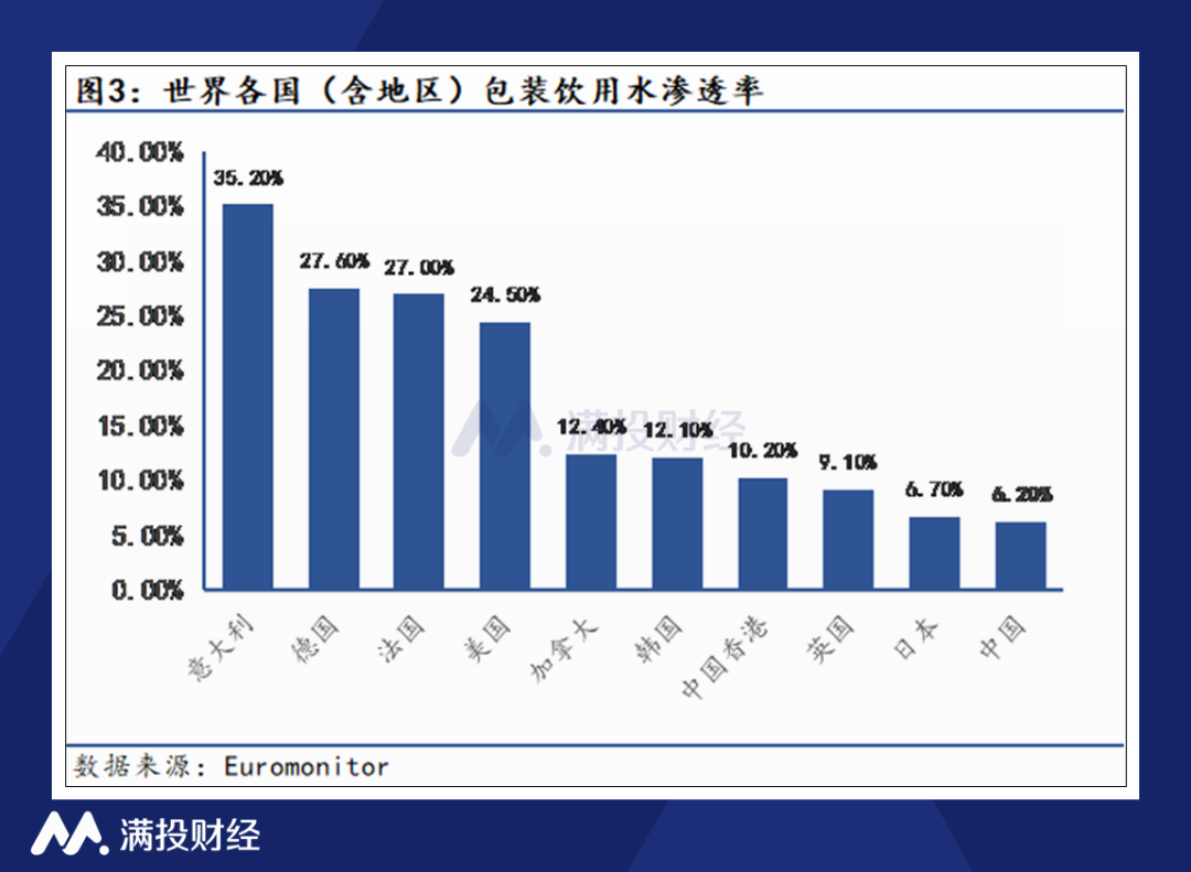 按市场规模划分,2021年包装饮用水市场占比为36%,是软饮料行业中最大的细分品类。而在中国,包装饮用水的渗透率还远远低于世界平均水平,市场空间有望持续扩大,抢先进入市场并拥有品牌效应成为企业占据市场高地的关键因素之一。