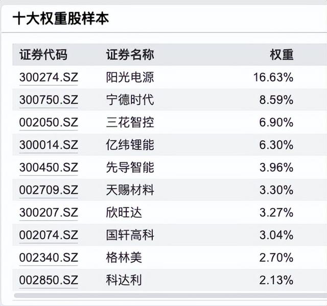 根据Wind,中证电池主题指数(931719.CSI)前十大重仓股分别是阳光电源、宁德时代、三花智控、亿纬锂能、先导智能、天赐材料、欣旺达、国轩高科、格林美、科达利。