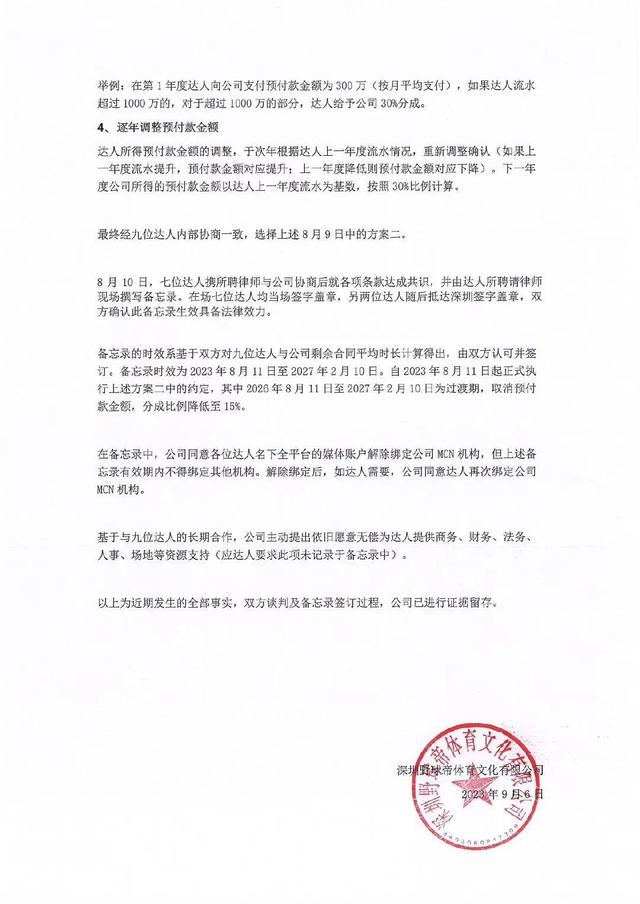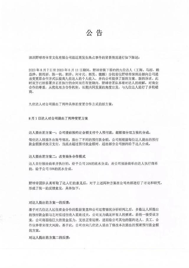 根据公告,今年8月上旬,野球帝旗下签约的9位达人突然向公司提出变更原合作方式的需求。彼时,达人与公司的合同并未到期。