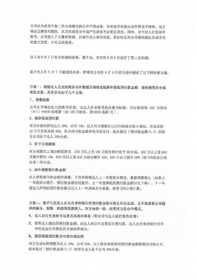 经过两轮谈判后,9位达人由原先公司员工、获取底薪+提成的收入方式,转变为自负盈亏,自行负责账号运营,同时按照一定比例向公司支付服务费用。