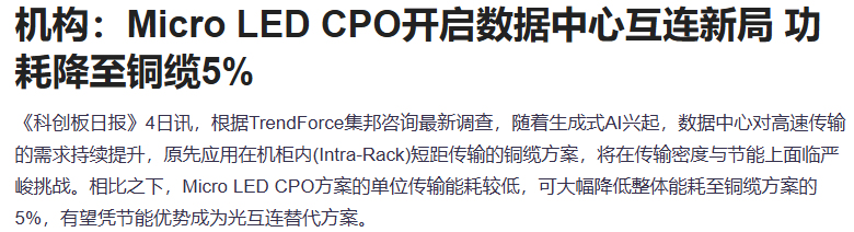 《科创板日报》4日讯,根据TrendForce集邦咨询最新调查,随着生成式AI兴起,数据中心对高速传输的需求持续提升,原先应用在机柜内(Intra-Rack)短距传输的铜缆方案,将在传输密度与节能上面临严峻挑战。相比之下,Micro LED CPO方案的单位传输能耗较低,可大幅降低整体能耗至铜缆方案的5%,有望凭节能优势成为光互连替代方案。