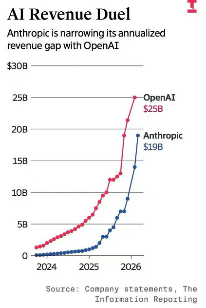 截至上月末,OpenAI 的年化收入已超过250 亿美元,较去年年底的 214 亿美元年化收入增长17%。OpenAI 的收入仍高于竞争对手 Anthropic,但两者差距正在快速缩小:Anthropic 的年化收入最近已突破190 亿美元,较去年年底增长近三倍,较两周前更是飙升36%。