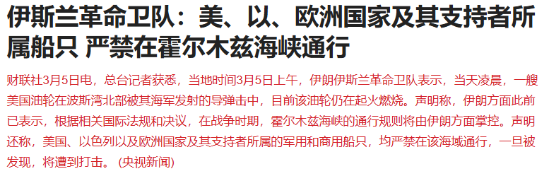 伊朗方面此前已表示,根据相关国际法规和决议,在战争时期,霍尔木兹海峡的通行规则将由伊朗方面掌控。声明还称,美国、以色列以及欧洲国家及其支持者所属的军用和商用船只,均严禁在该海域通行,一旦被发现,将遭到打击。