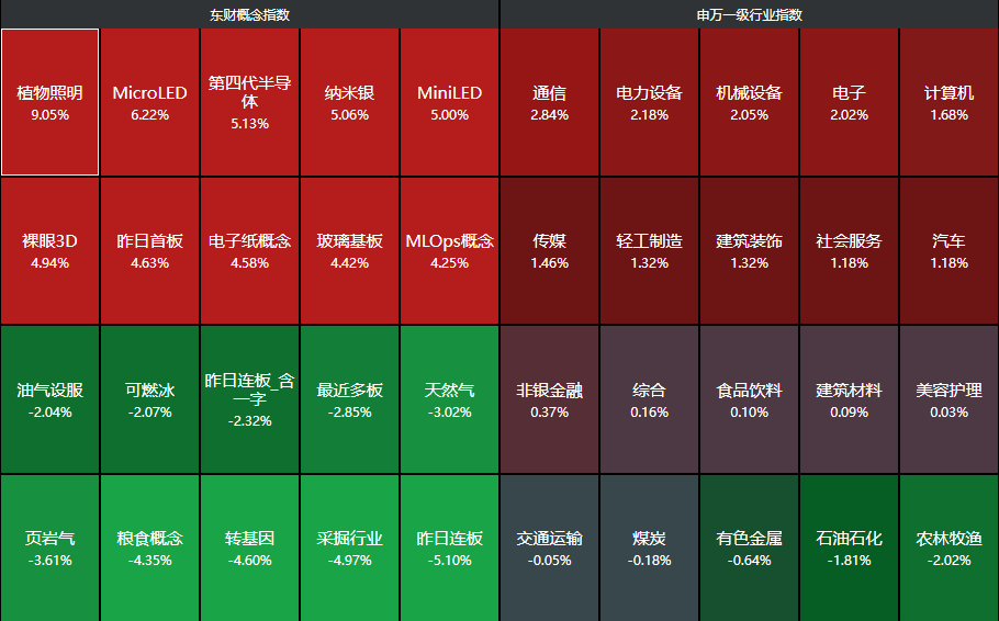分行业来看,通信、电力设备、机械设备、电子、计算机等行业领涨,农林牧渔、石油石化、有色金属等行业领跌。