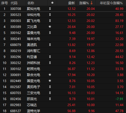 今天光电子器件板块掀起涨停潮,聚灿光电、华灿光电、聚飞光电、雷曼光电、三安光电等多股涨停。