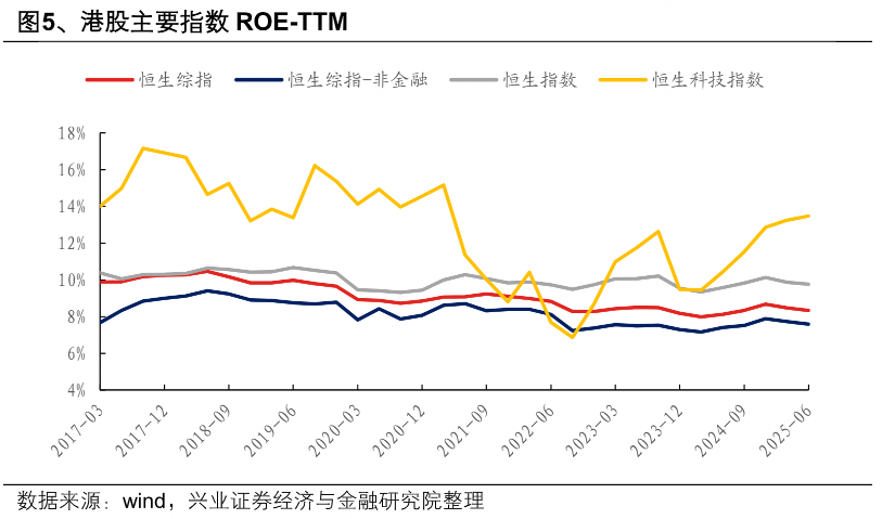 恒生科技ROE同比提升最为明显,上升3.04pcts至13.5%;恒生指数ROE同比+0.19pcts,恒生综指同比+0.21pcts,恒生综指非金融同比+0.18pcts。