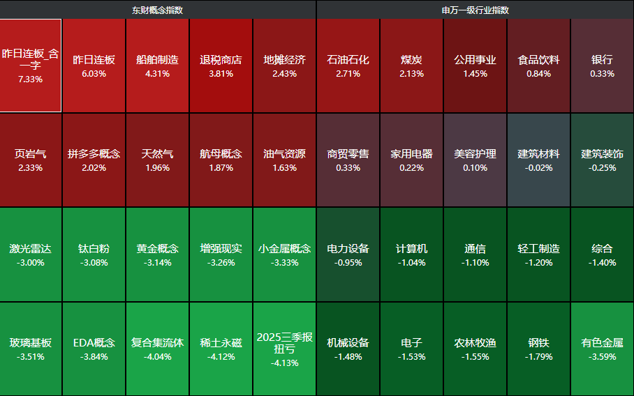 分行业来看,石油石化、煤炭、公用事业、食品饮料、银行等行业领涨,有色金属、钢铁、农林牧渔等行业领跌。