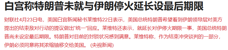 美国白宫新闻秘书莱维特22日表示,美国总统特朗普希望看到伊朗领导层对美方提出的结束敌对行动的提议做出“统一”回应。莱维特还表示,就延长对伊停火期限一事,美国总统特朗普尚未设定最后期限。特朗普对目前的封锁状况感到满意。