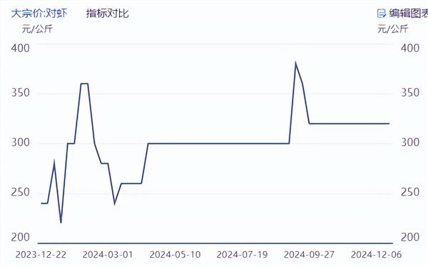 然而,数据显示,下半年水产市场已呈现出回暖趋势。以对虾价格为例,其上半年一度跌至220元/公斤,但自10月起已基本稳定在320元/公斤左右。