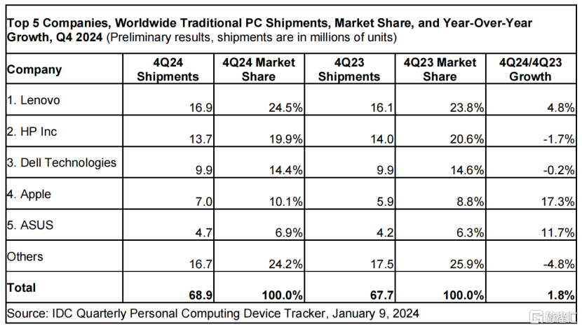 根据IDC最新报告,2024年第四季度全球PC出货量同比增长1.8%,达到6890万台;全年出货量为2.627亿台,同比增长1%。
