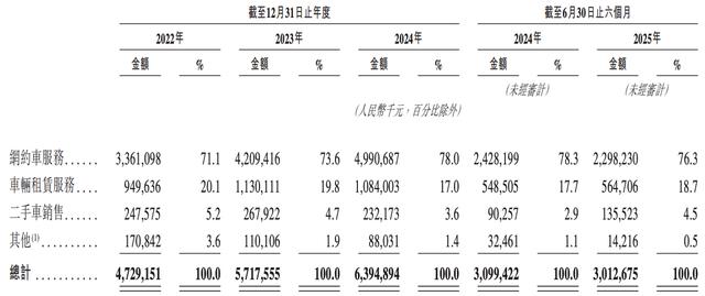 2022年、2023年、2024年度和2025年上半年(下同“报告期”),享道出行来自网约车业务的收入分别约为33.61亿元、42.09亿元、49.99亿元和22.98亿元,分别占其总收入的71.1%、73.6%、78.0%、78.3%和76.3%。