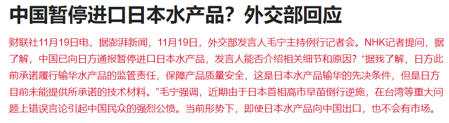 据财联社报道,NHK记者提问,据了解,中国已向日方通报暂停进口日本水产品,外交部做出回应。受该消息刺激,A股水产板块掀起涨停潮,国联水产、獐子岛、中水渔业等多股涨停。