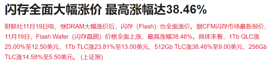 据CFM闪存市场最新报价,11月19日,Flash Wafer(闪存晶圆)价格全面上涨,最高涨幅38.46%。