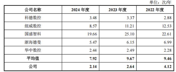 在账龄结构恶化的同时,钶锐锶应收账款周转效率也在同步下滑,进一步反映出资金回收能力的减弱。报告期内,公司应收账款周转率分别为4.12次/年、2.64次/年、2.14次/年,周转率趋缓的原因主要是报告期内应收账款增长幅度大于营收增长幅度。值得一提的是,其周转率远低于可比公司均值的9.46次/年、9.67次/年、7.92次/年,2023年及2024年周转率不到可比公司均值的三分之一。
