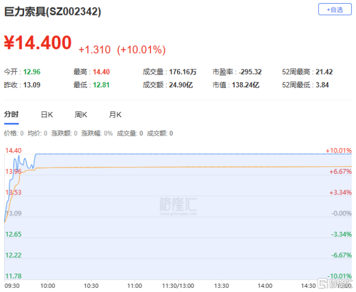 巨力索具:今日涨停,全天换手率18.45%,成交额24.90亿元。机构净买入3602.45万元,深股通净买入1016.43万元,营业部席位合计净买入2.97亿元。