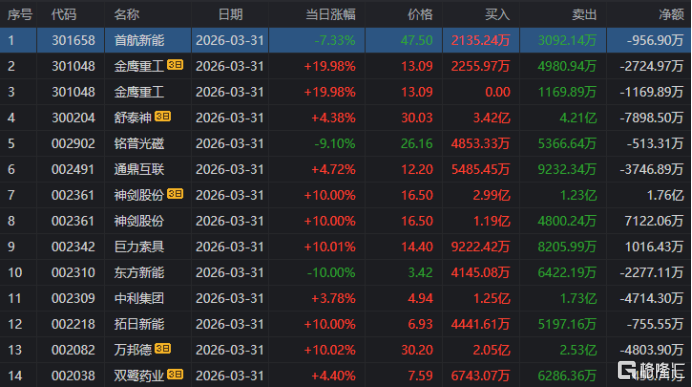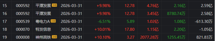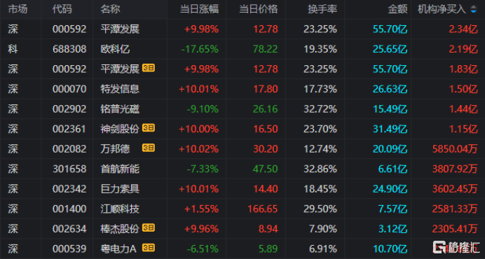龙虎榜中涉及机构专用席位的个股中,当日净买入额前三为平潭发展、特发信息、铭普光磁,分别为2.34亿元、1.5亿元、1.44亿元。