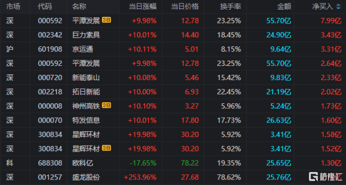 龙虎榜单日净买入额前三为巨力索具京运通、平潭发展,分别为3.43亿元、3.31亿元、2.64亿元。