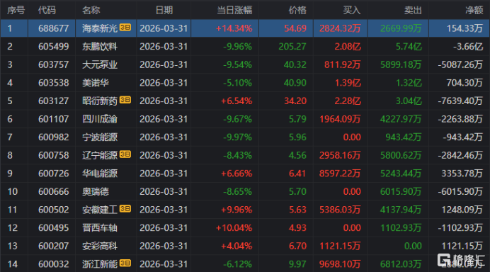 宁波桑田路:净买入华电能源4975万元;净卖出平潭发展1.633亿元