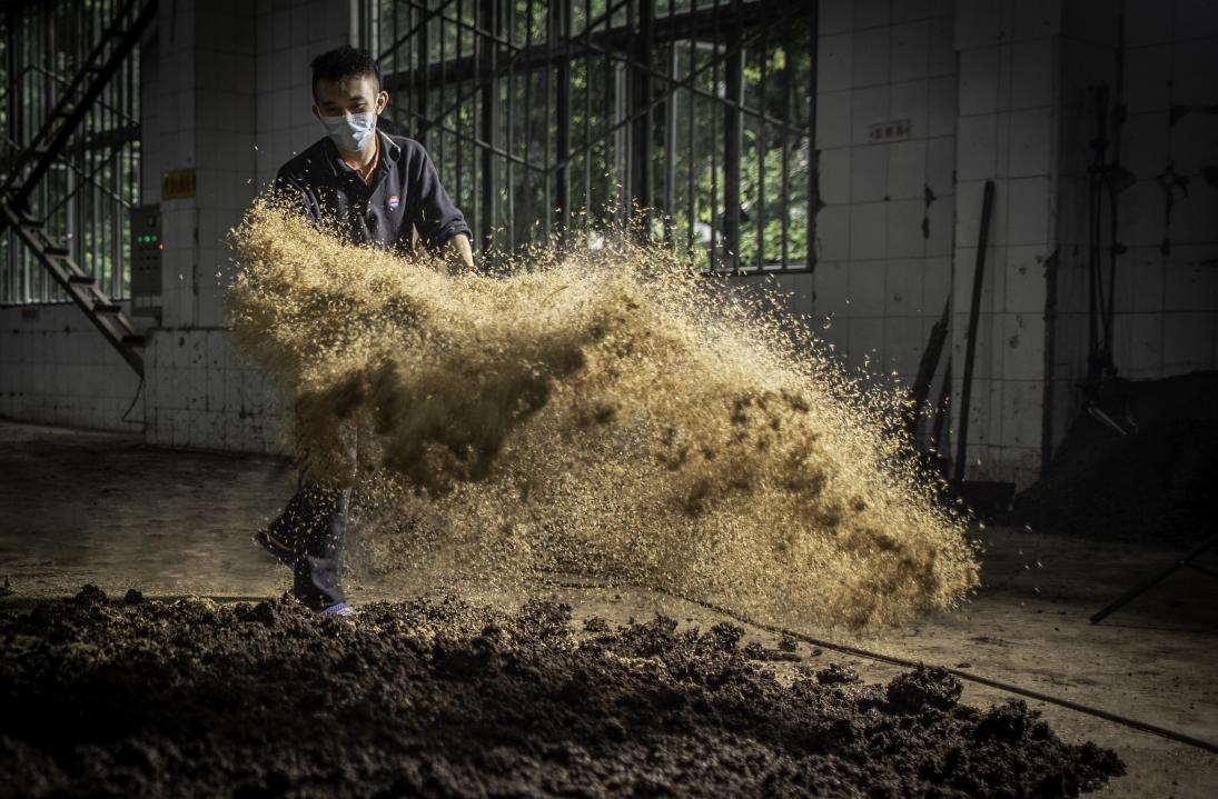 一个月后,制酒工人从酒窖里取出下沙时发酵过的酒醅,和另一半高粱按1:1混合在一起,再次重复从高温蒸煮到入窖发酵的流程,这个过程被称为“造沙”。