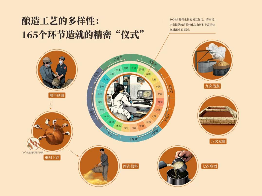 这种酿造工艺的多样性,不是技术的堆砌,而是人与自然的协作。从“端午制曲”到“重阳下沙”,千百年来,茅台人遵循自然时令规律、采用复杂酿造工艺、耐心贮存数年时光,终于将小麦、高粱和水酿成风味如此丰富的茅台美酒。