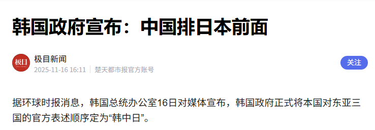 韩国总统办公室16日对媒体宣布,韩国政府正式将本国对东亚三国的官方表述顺序定为“韩中日”。