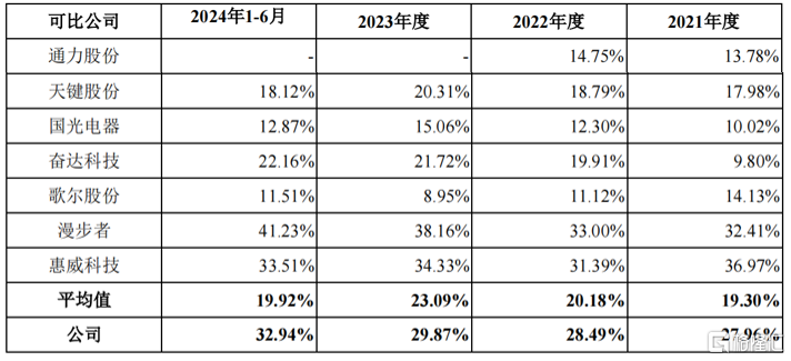 报告期各期,汉桑科技的综合毛利率分别为27.96%、28.49%、29.87%和32.94%,高于可比公司平均值。主要原因在于,汉桑科技的客户定位相对高端,产品单价相对较高。
