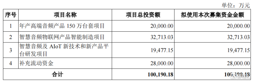 公司本次发行上市计划募集资金10亿元,将投资于年产高端音频产品150万台套项目、智慧音频物联网产品智能制造项目、智慧音频及AIoT新技术和新产品平台研发项目和补充流动资金项目。