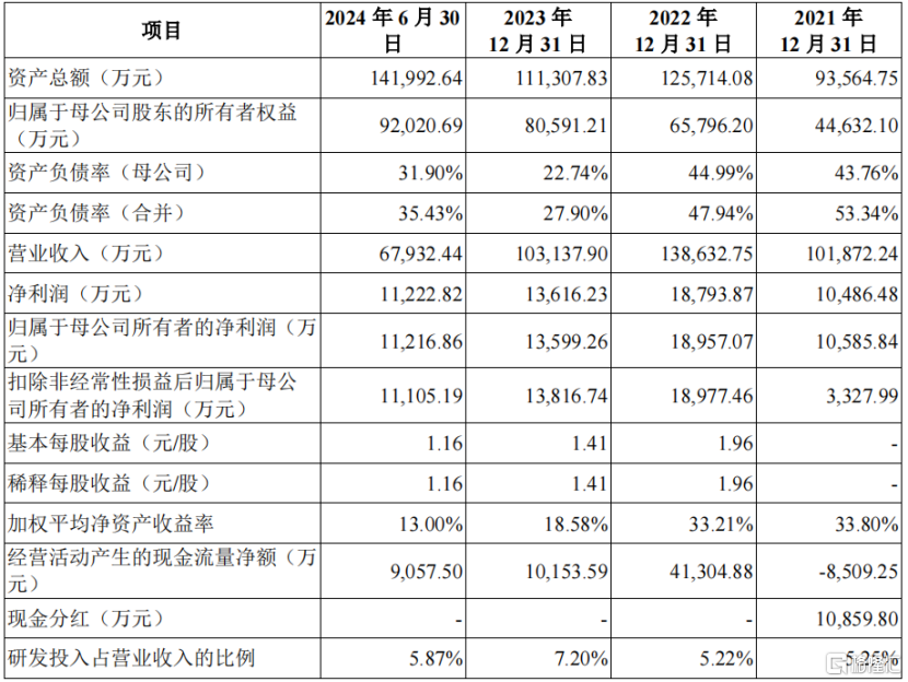 2021年、2022年、2023年及2024年1-6月(报告期),汉桑科技分别实现营业收入10.19亿元、13.86亿元、10.31亿元和6.79亿元,同期归母净利润分别为1.06亿元、1.9亿元、1.36亿元和1.12亿元。