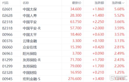 保险股普涨,中国太保、中国人寿涨超5%,中国平安、中国太平、云锋金融、众安在线、阳光保险、友邦保险等跟涨。