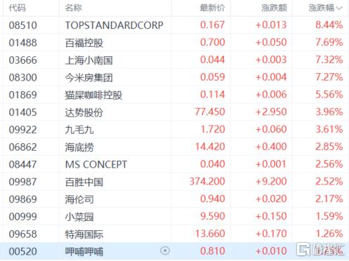 餐饮股集体活跃,达势股份涨近4%,九毛九、海底捞、百胜中国、小菜园、特海国际等跟涨。