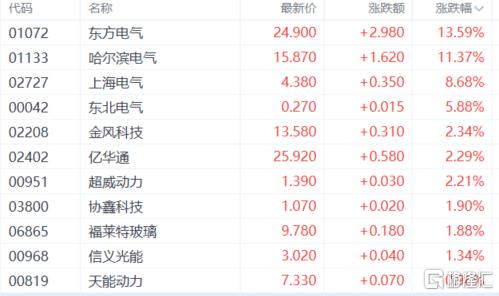 电力设备股走强,东方电气涨超13%,哈尔滨电气涨超11%,上海电气、东北电气、金风科技、亿华通、超威动力、协鑫科技、福莱特玻璃等跟涨。