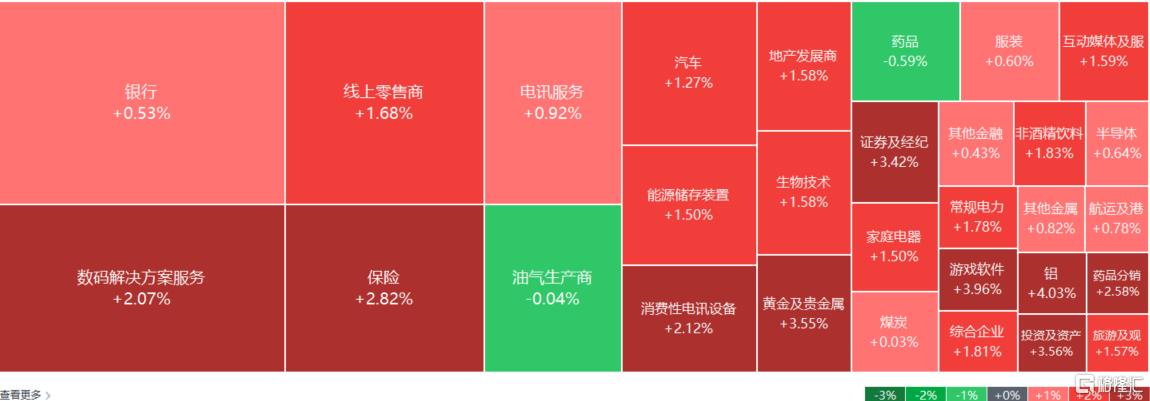 另一方面,药品板块下挫,海普瑞跌超7%;环保、铁路及公路、国内零售股、烟草、油气生产商等少数板块下跌。