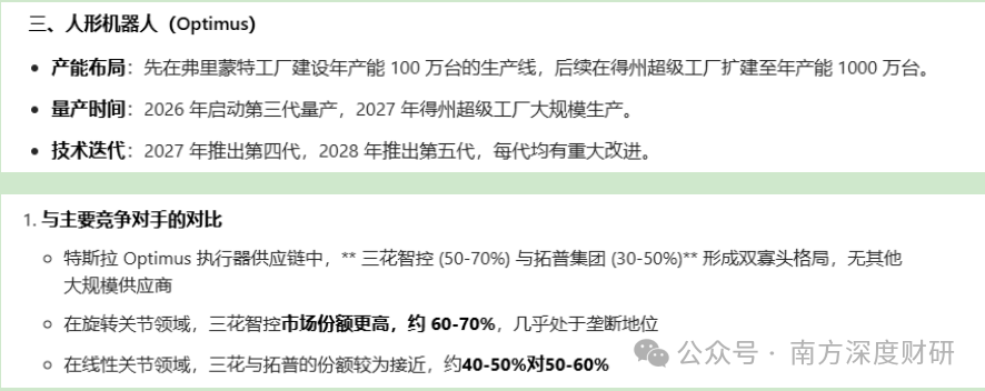 2、产能与订单:据外部媒体报道,公司的墨西哥基地将在2025年三季度投产,杭州基地将在2026年一季度量产,公司规划了年产100万台执行器。市场预期三花智控在特斯拉Optimus供应链中能占据30%-70%份额,单台价值超5万元(占机器人硬件成本35%);国内方面,公司与优必选、小米合作,提供谐波减速器、关节总成(但目前并未在公告中找到相关信息佐证)。